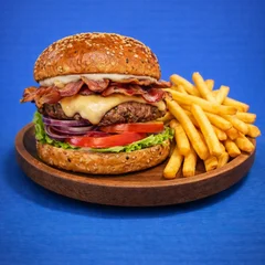 Burger feito com 02 blends de 150g bem suculento, queijo,, alface americana crocante, tomate fresco, cebola roxa fininha, pickles, bacon crocante e maionese de bacon. O clássico que mata sua fome